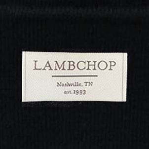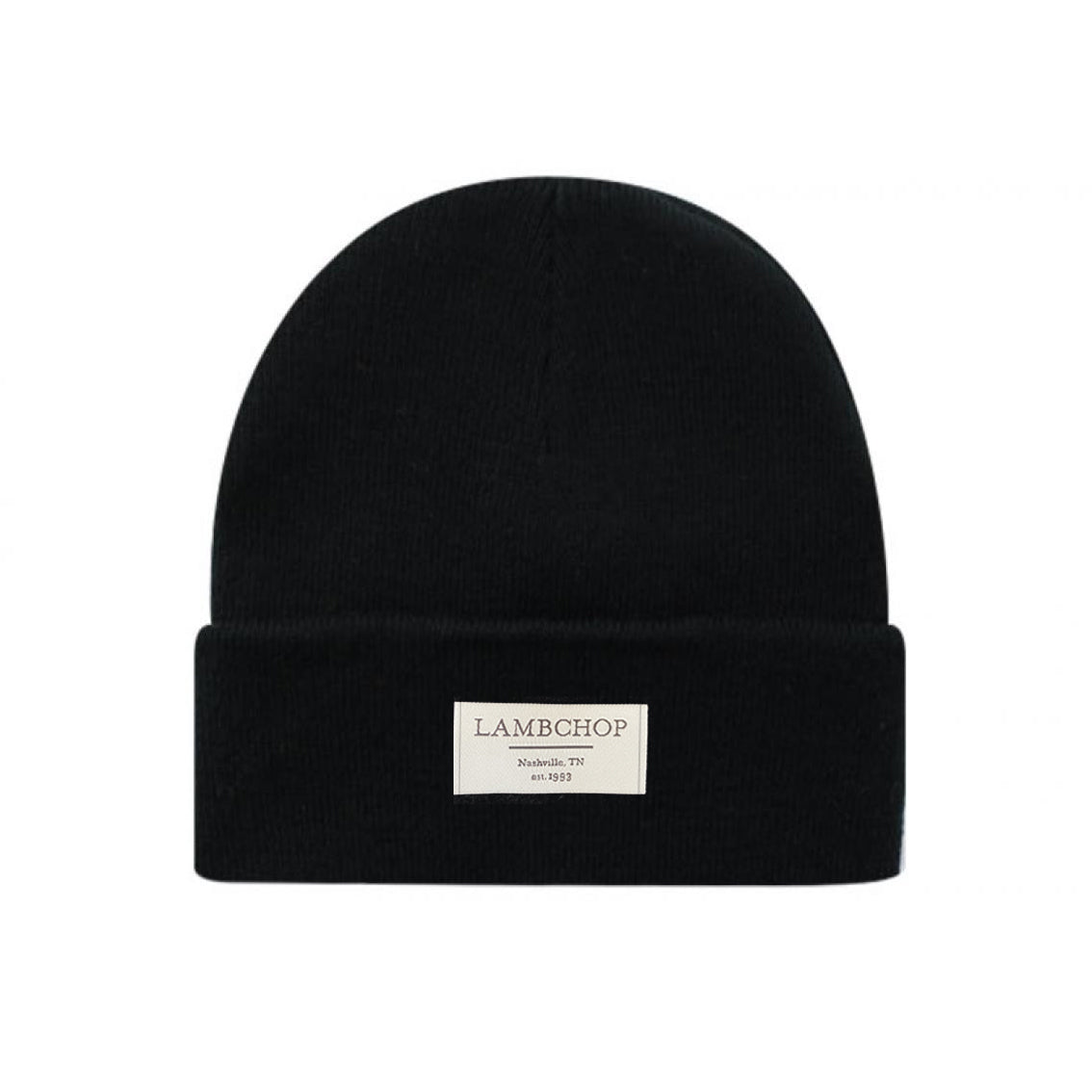 Cuffed black beanie hat with "Lambchop" label sewn on front